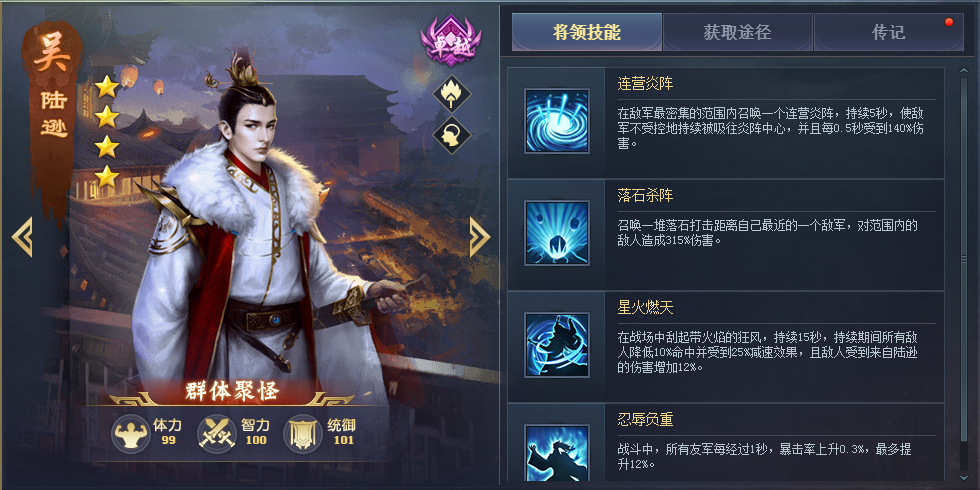 半辅助半输出将领,输出较高高,三技能开局加急速恢复怒气,能让己方武将更快的释放技能,能搭配四技能降低防御,让己方打人伤害更高。